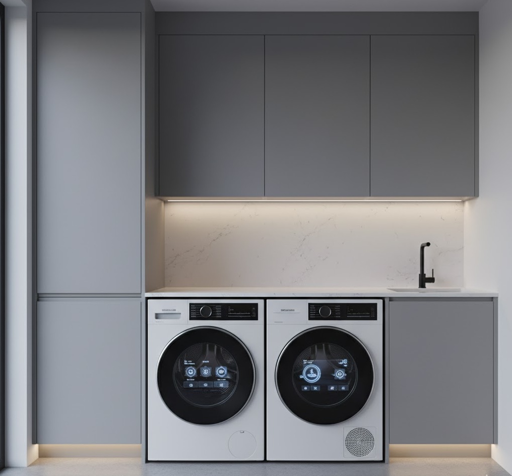 For a sleek and contemporary feel, a modern tiny laundry space prioritises cutting-edge design and maximum efficiency within minimal square footage. This style often features high-gloss or matte cabinetry in sophisticated neutrals like charcoal, navy, or pure white, accented with metallic hardware. Integrated appliances and smart storage solutions are key, ensuring a seamless and uncluttered appearance. Materials such as polished concrete, sleek quartz, and geometric tiles add to the contemporary aesthetic, creating a sharp and functional environment. The mood is one of sophisticated efficiency, transforming a mundane chore into a stylish experience.