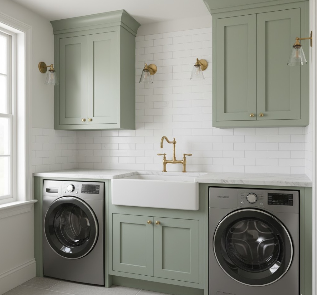 A traditional compact laundry design offers timeless elegance and enduring functionality, perfect for those who appreciate classic aesthetics. This style typically features shaker-style cabinetry in muted colours like soft creams, sage greens, or gentle blues, paired with ornate brass or polished nickel hardware. Subway tiles or classic patterned wallpaper often adorn the walls, adding a touch of refined charm. Practical elements are seamlessly integrated, with ample closed storage to maintain a tidy and sophisticated appearance. The mood is one of understated luxury and enduring quality, creating a laundry space that feels both welcoming and impeccably organised.