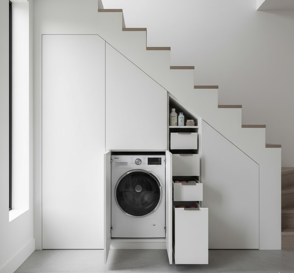 Transform an often-underutilised space with an under stair laundry solution, demonstrating ingenious design in compact living. This approach involves custom-built cabinetry and shelving perfectly tailored to the awkward angles beneath a staircase, maximising every available inch. Compact, stackable appliances are typically integrated, alongside clever pull-out storage for detergents and laundry essentials. A light colour palette helps to brighten the confined area, making it feel less enclosed and more purposeful. The mood is one of clever innovation and efficient space-saving, turning a forgotten corner into a highly functional and discreet utility area.