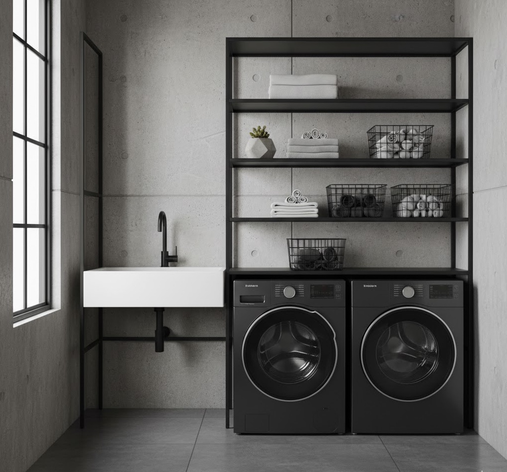 Embrace the raw charm of city living with an urban loft laundry area, integrating industrial elements into a stylish, functional space. This design often features exposed concrete walls or ceilings, black metal accents, and sleek, modern appliances, reflecting a contemporary urban sensibility. A monochromatic colour scheme of greys, blacks, and whites is typical, creating a sophisticated and edgy backdrop. Open shelving and robust, utilitarian fixtures contribute to the authentic loft feel, while maintaining practical storage. The mood is one of cool sophistication and industrial chic, transforming the laundry space into a statement of modern urban design.