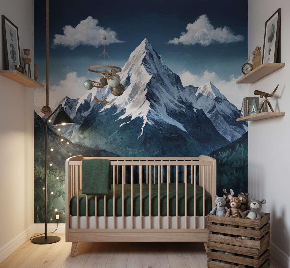 An adventure themed nursery sparks imagination and wonder, even within a small footprint. This style can draw inspiration from forests, mountains, outer space, or global travel, using a palette of earthy tones, deep blues, or starry blacks, often with vibrant accents. Materials might include wooden furniture, themed wall murals or decals, and textiles featuring maps or constellations. Functionality is key, with clever storage like treasure chests or themed shelving keeping the space tidy. The mood is exciting and inspiring, transforming a compact room into a world of exploration, making this small nursery a stimulating and fun environment.