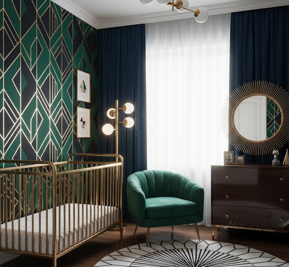 An Art Deco inspired nursery brings a touch of vintage glamour and geometric sophistication to a small space. This style features bold, symmetrical patterns, luxurious materials, and a rich colour palette often including deep blues, emerald greens, gold, and cream. Furniture might have sleek, curved lines or metallic accents, reflecting the era’s opulence. Materials like velvet, polished wood, and brass are key, adding texture and shine. Functionality is integrated through elegant storage pieces that double as decorative elements. The mood is chic and opulent, transforming a compact room into a stylish and distinctive small nursery with a unique flair.