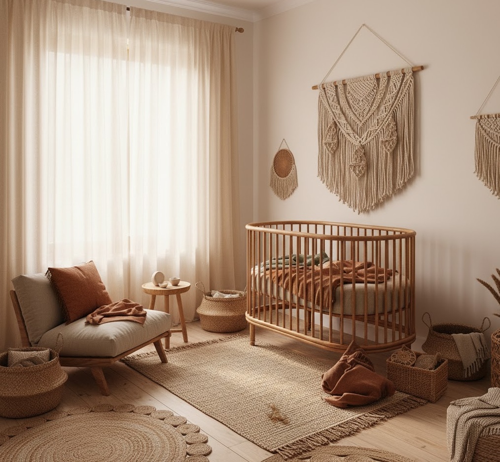A boho tiny nursery exudes warmth and free-spirited charm, even in the most compact of spaces. This style incorporates natural textures, earthy tones, and eclectic patterns to create a cosy, inviting atmosphere. Think rattan furniture, macramé wall hangings, and layered rugs made from jute or wool. The colour palette often includes terracotta, sage green, mustard yellow, and cream, providing a grounding feel. Functionality is achieved through clever use of vertical space with hanging planters or shelves, and floor cushions offer flexible seating. This small nursery design feels wonderfully personal and comforting, celebrating natural beauty and a relaxed vibe.