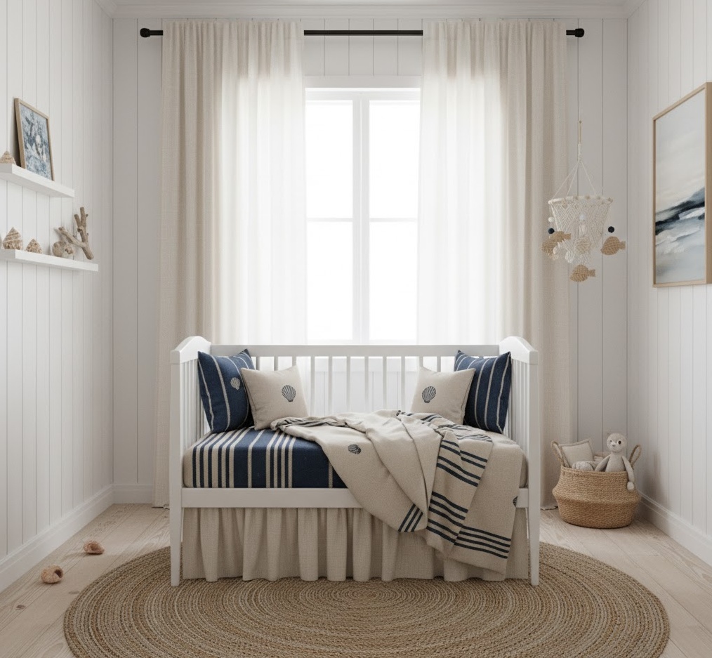 A coastal small nursery brings the calming essence of the seaside indoors, perfect for creating a tranquil retreat. This style typically features a fresh colour palette of whites, blues, and sandy beiges, evoking a breezy, open feel that helps a compact room appear larger. Materials often include whitewashed wood, natural fibres like linen and jute, and subtle nautical accents. Functionality is maintained with clever storage solutions that blend seamlessly, such as built-in shelving or wicker baskets. The mood is light, airy, and peaceful, transforming a tiny space into a serene haven, making it an ideal small nursery idea for a calming atmosphere.