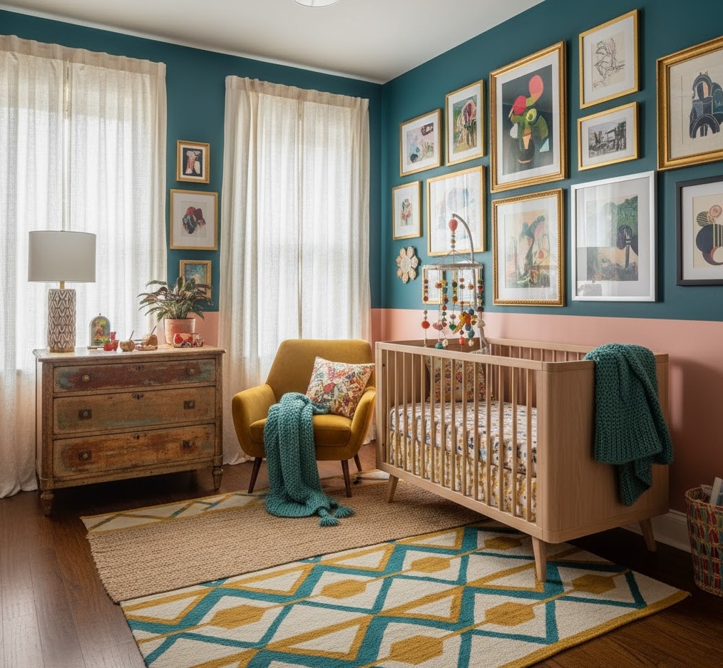 An eclectic compact nursery celebrates individuality and creativity, blending various styles and periods to create a uniquely personal space. This approach allows for a vibrant mix of colours, patterns, and textures, making a small room feel rich and full of character. Key elements might include a vintage cot paired with a modern rug, or global-inspired textiles alongside contemporary art. Functionality is achieved by carefully curating pieces that serve a purpose while adding visual interest, often utilising vertical space with varied shelving. The mood is playful and expressive, proving that a small nursery can be a bold and wonderfully unique reflection of personality.