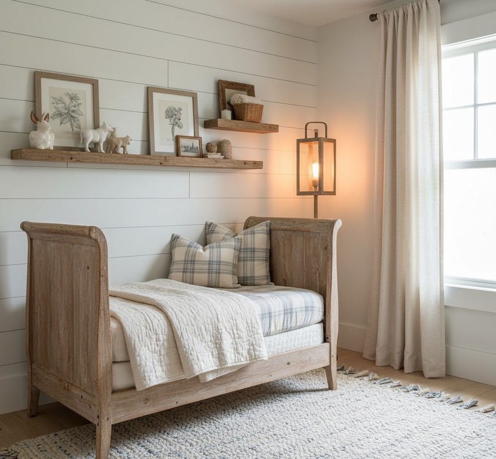 A farmhouse small nursery offers a charming blend of rustic warmth and cosy comfort, ideal for creating an inviting atmosphere in a compact room. This style features natural wood elements, often distressed or painted white, paired with a soft, neutral colour palette of creams, greys, and muted blues or greens. Materials like shiplap walls, woven textures, and simple cotton fabrics are common. Functionality is achieved through sturdy, practical furniture and charming storage solutions like open shelving or vintage-style crates. The mood is welcoming and homely, making this small nursery feel like a snug, comforting retreat with timeless appeal.