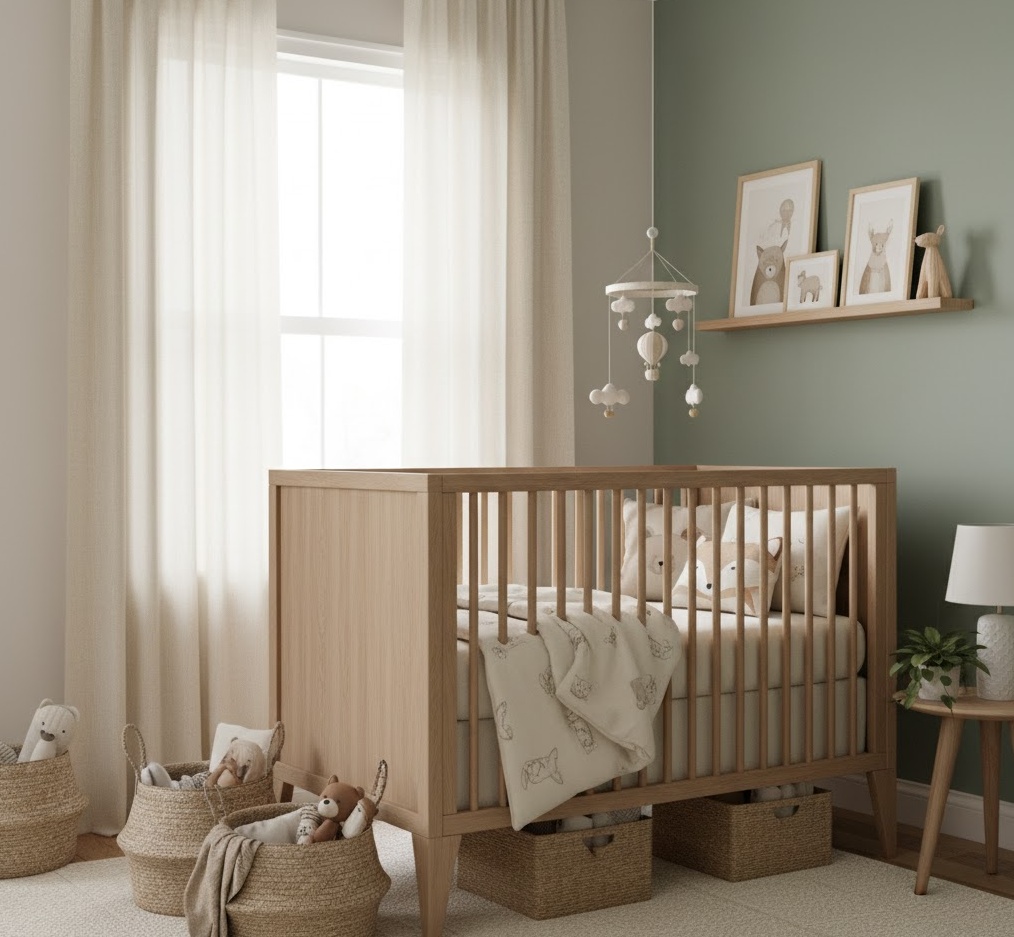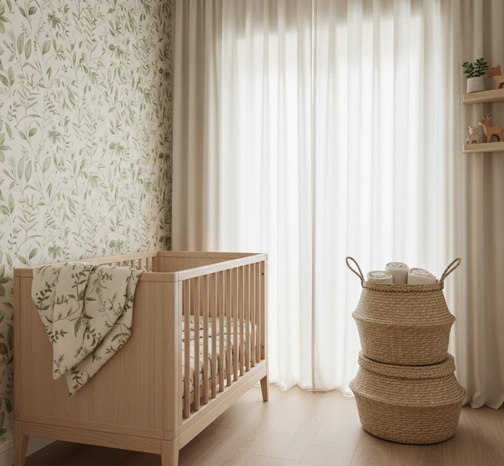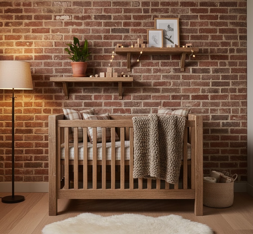 A rustic tiny nursery brings the warmth and charm of the countryside into a compact space, creating a cosy and inviting atmosphere. This style celebrates natural, raw materials such as reclaimed wood, exposed brick (or wallpaper), and textured fabrics like wool and linen. The colour palette typically features earthy tones – think warm browns, deep greens, and creams – often accented with subtle plaid or gingham patterns. Functionality is achieved through sturdy, handcrafted-looking furniture and practical storage like wooden crates or open shelving. The mood is comforting and grounded, making this small nursery feel like a snug, natural retreat.