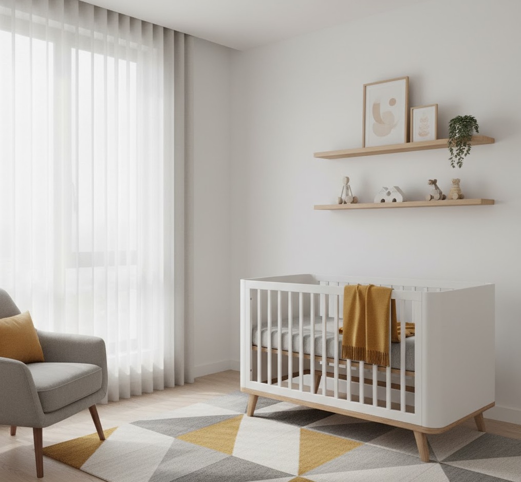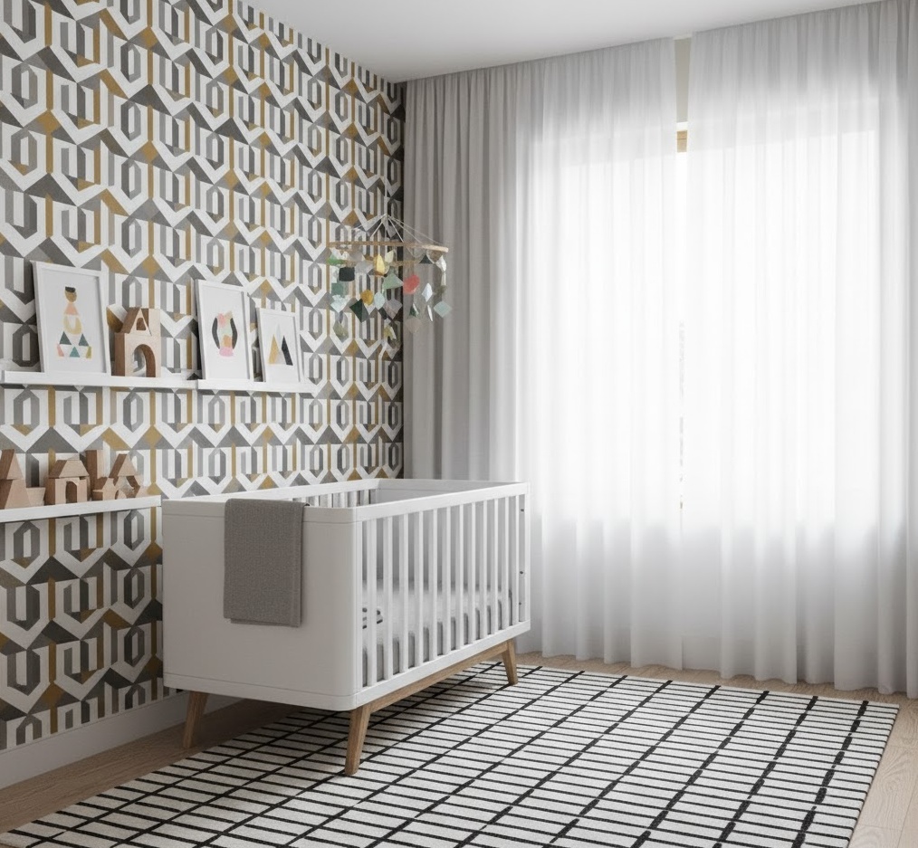 A geometric small nursery uses bold shapes and patterns to create a dynamic and visually engaging space, perfect for adding character to a compact room. This style often features a modern colour palette, perhaps with a dominant neutral and one or two vibrant accent colours. Geometric wallpaper, rugs, or wall art are key elements, adding depth and interest without clutter. Furniture is typically sleek and contemporary, with clean lines that complement the structured patterns. Functionality is maintained through smart, space-saving designs and integrated storage. The mood is playful yet sophisticated, making this small nursery feel energetic and stylishly organised.