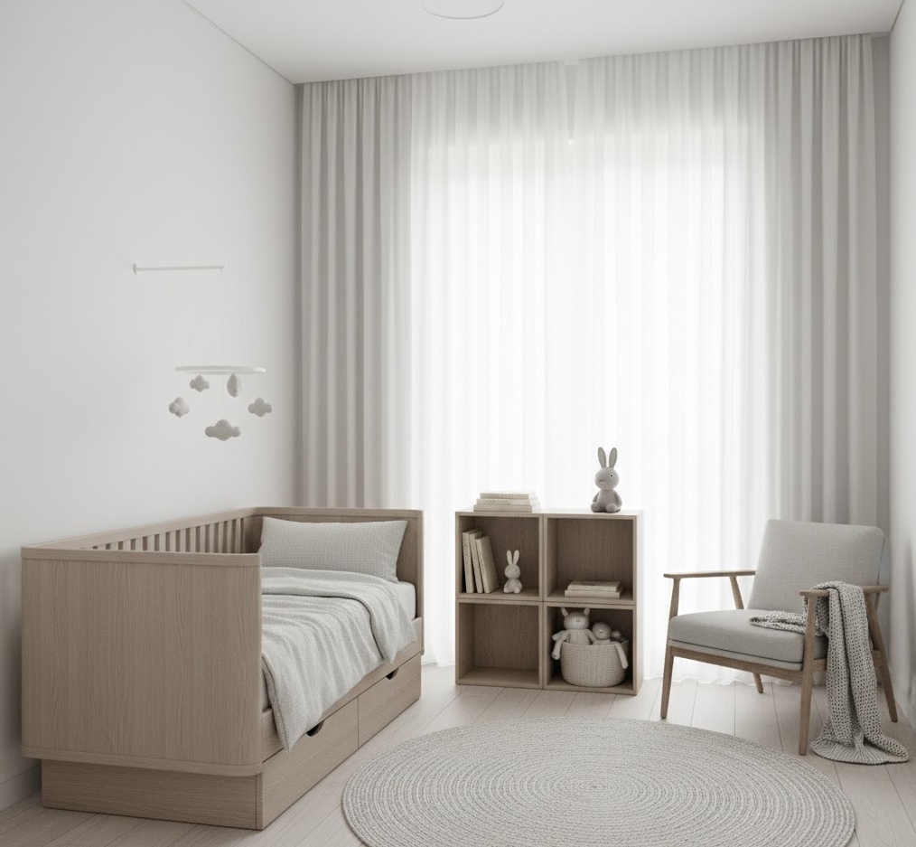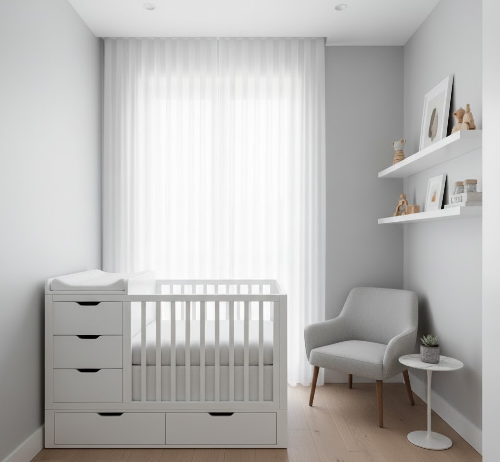 A space saving nursery is all about ingenious solutions to maximise functionality in the smallest of rooms. This style prioritises multi-functional furniture, such as cots with built-in changing tables or storage drawers, and wall-mounted shelving or fold-down units. The colour palette is typically light and airy to enhance the feeling of space, often using whites, creams, and soft pastels. Materials are chosen for their practicality and durability, often sleek and easy to clean. The mood is efficient and uncluttered, demonstrating how smart design can transform a tiny area into a highly practical and comfortable small nursery without compromising on style.