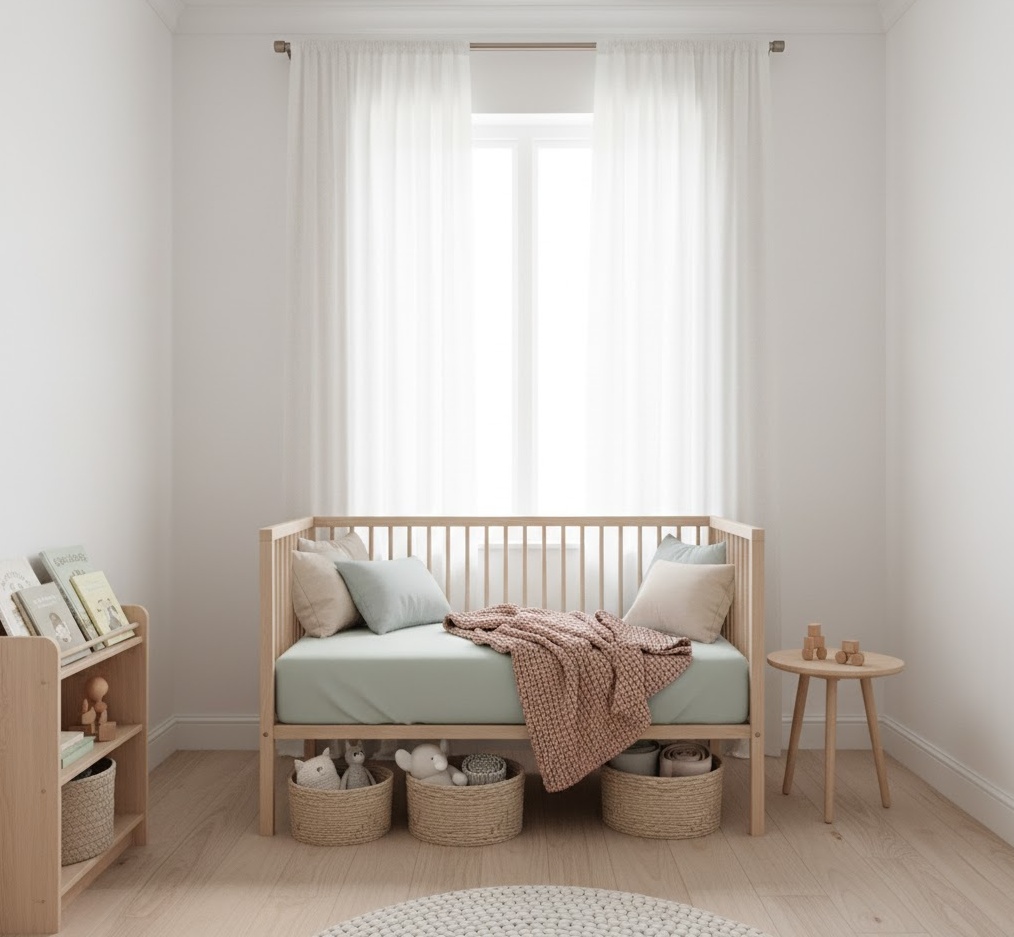 A Scandi compact nursery champions simplicity, functionality, and natural light, making it ideal for smaller rooms. This aesthetic relies on a bright, airy feel achieved through white walls, light wood furniture, and soft, muted colours like pastels or earthy tones. Key elements include a simple cot, a comfortable armchair, and clever storage solutions such as open shelving or woven baskets to keep the space tidy. Textiles are often natural, like wool or cotton, adding texture and warmth without clutter. The mood is tranquil and inviting, creating a nurturing environment that feels spacious and effortlessly stylish, perfect for any small nursery.