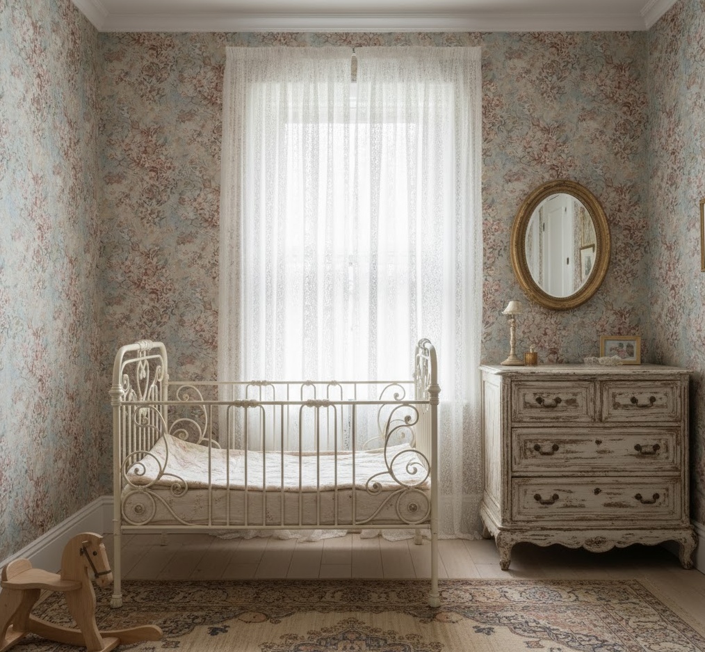 A vintage small nursery evokes a sense of nostalgia and timeless elegance, perfect for adding character to a compact room. This style often incorporates antique or retro-inspired furniture, such as an ornate metal cot or a classic wooden dresser, paired with delicate patterns like florals or polka dots. The colour palette might include muted pastels, soft creams, or faded blues and pinks, creating a gentle, aged aesthetic. Materials like lace, velvet, and distressed wood contribute to the authentic feel. Functionality is achieved by repurposing old pieces or using charming storage boxes. The mood is sweet and charming, making this small nursery feel uniquely personal and full of history.