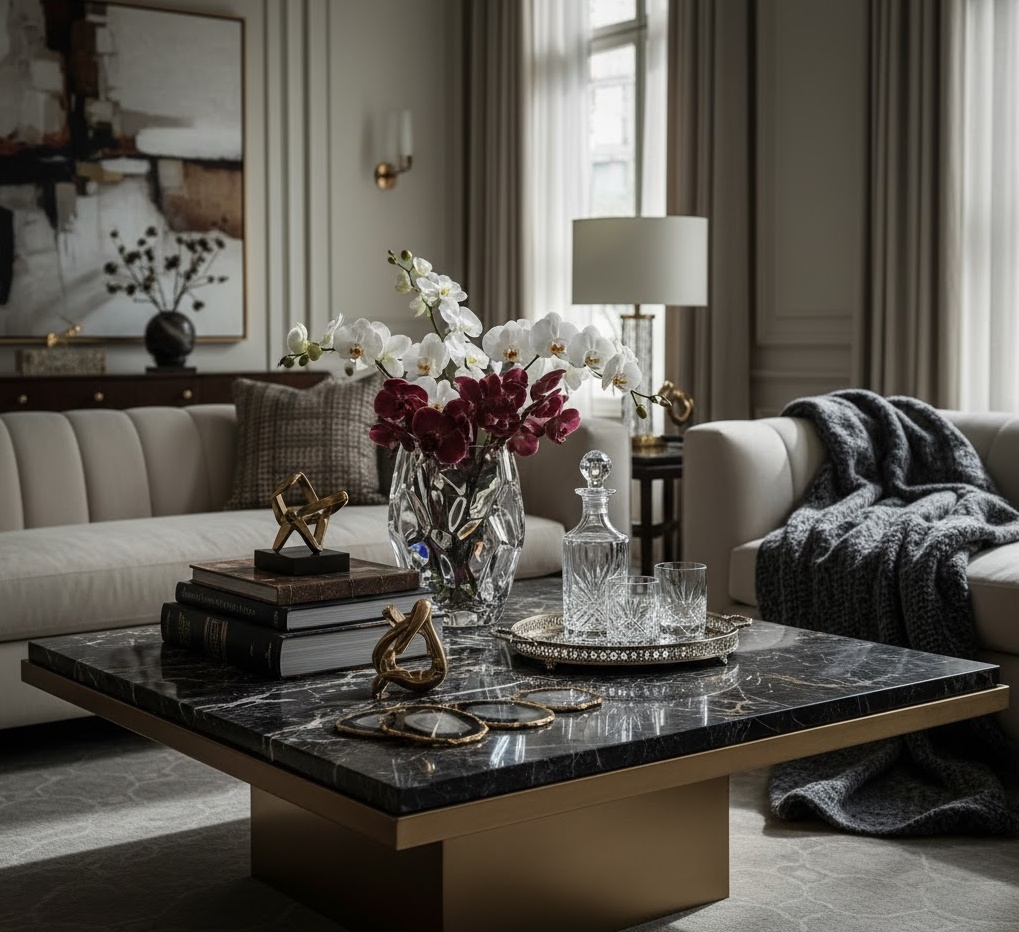 Classic elegant square coffee table decor exudes timeless sophistication and refined taste, creating an atmosphere of enduring grace. This style incorporates traditional elements such as polished silver trays, crystal or cut-glass vases with fresh flowers, antique-inspired decorative boxes, and perhaps a stack of leather-bound literary classics, evoking a sense of heritage and luxury. The colour palette is typically understated and rich, featuring deep blues, forest greens, burgundy, and creams, often accented with gold or silver, fostering a dignified and inviting mood. Functionality is subtly integrated, with decor items chosen for their enduring beauty and practical use, ensuring the square coffee table remains a practical and aesthetically pleasing surface for entertaining or quiet reflection. This approach to square coffee table styling celebrates enduring beauty and traditional craftsmanship, transforming your living area into a distinguished and comfortable space that feels both grand and intimately welcoming.