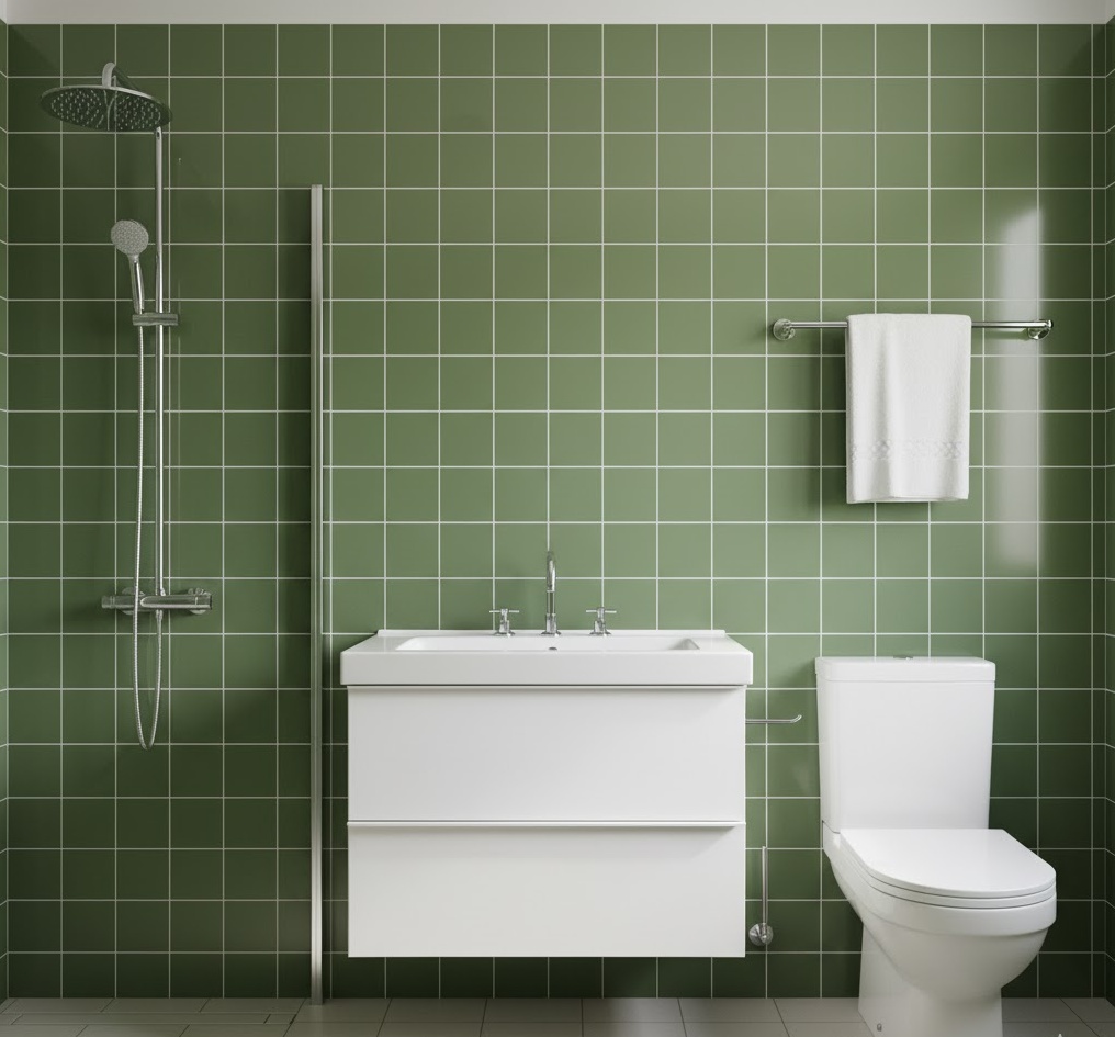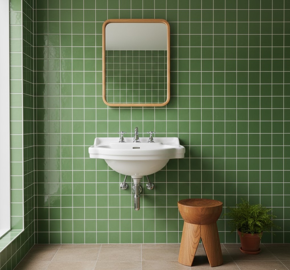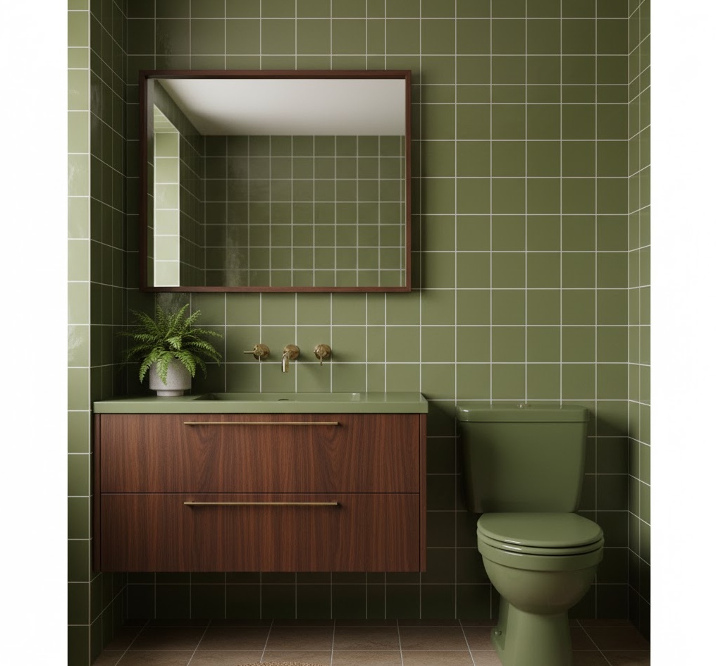 For a sophisticated and earthy vintage 70s bathroom, olive green offers a rich and calming colour choice. This deep, muted green evokes a sense of nature and tranquility, often appearing on wall tiles, painted cabinets, or even a full bathroom suite. It pairs exceptionally well with natural materials like dark wood, terracotta, and brass accents, enhancing its organic appeal. Functionality is easily achieved with robust, classic fixtures that complement the period aesthetic. The mood is one of understated elegance and peaceful retreat, providing a timeless yet distinctly 70s washroom experience that feels both luxurious and grounded.