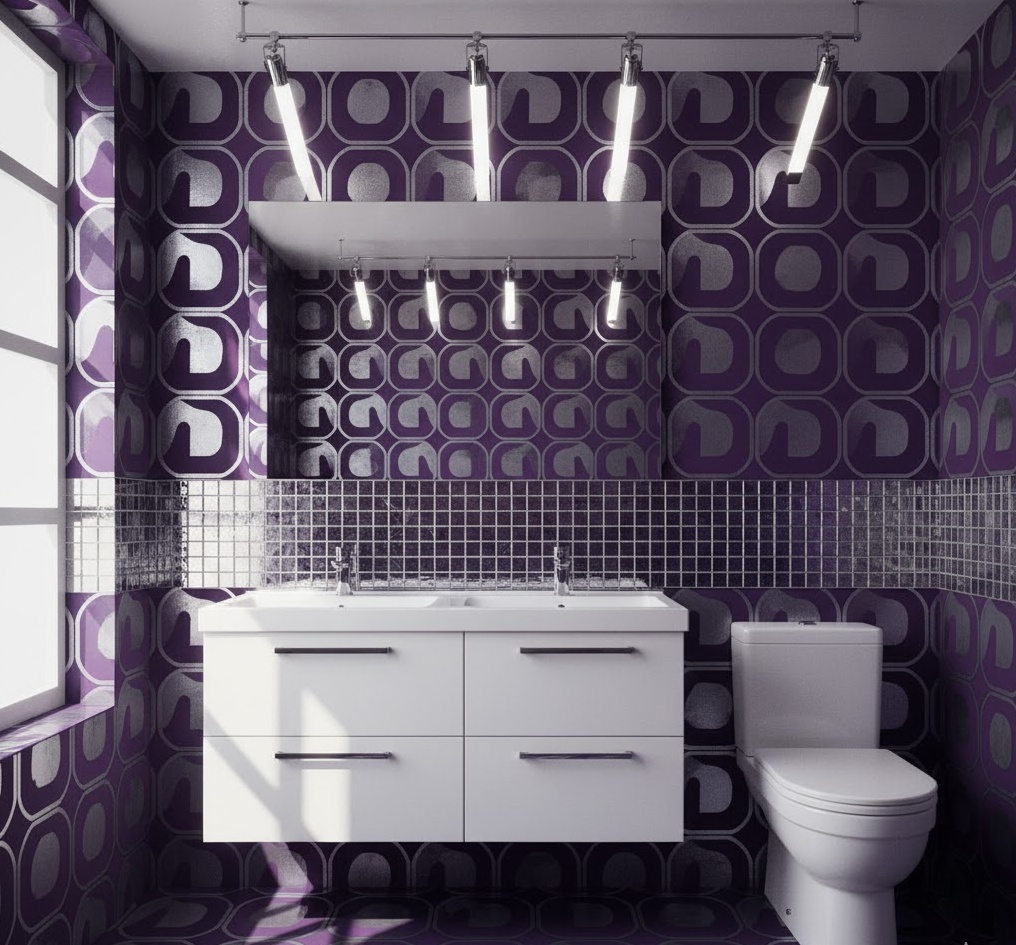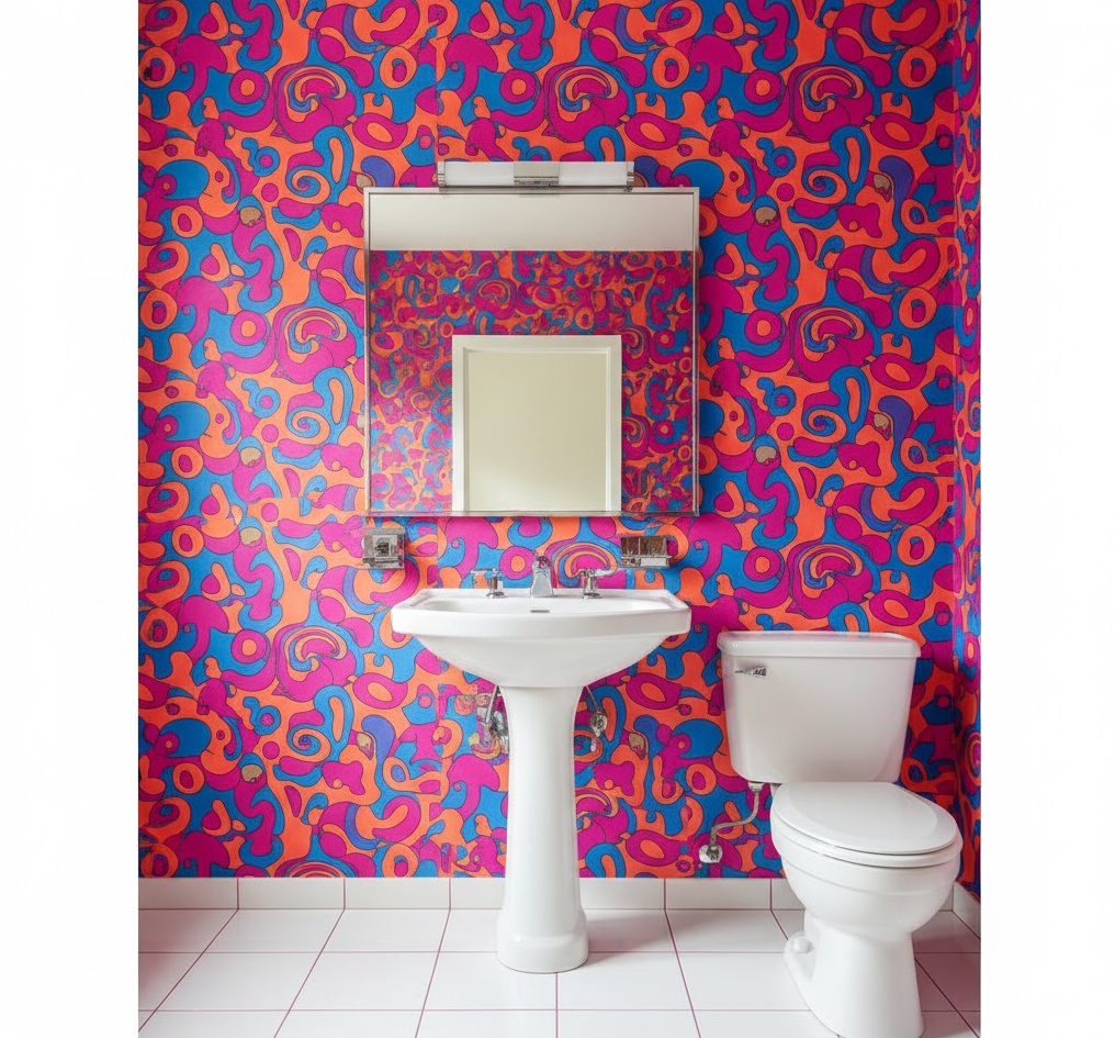 For the adventurous homeowner, a psychedelic patterned vintage 70s bathroom offers an explosion of colour and dynamic design. This style is characterised by bold, swirling, and often abstract patterns, typically found on wallpaper, shower curtains, or even floor tiles. Vibrant hues like fuchsia, electric blue, lime green, and orange are combined to create a truly eye-catching and energetic space. Keep the sanitaryware simple and white to allow the patterns to be the undisputed focal point, ensuring functionality isn’t compromised by the visual feast. The mood is playful and exhilarating, a true homage to the era’s counter-culture movement, making every visit a vibrant experience.