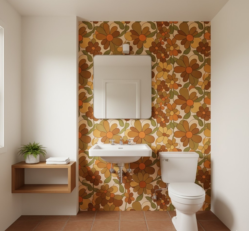 Bring the beauty of nature indoors with a floral wallpaper retro bathroom, a charming and popular choice for vintage 70s interiors. These wallpapers often featured large, stylised floral patterns in vibrant or earthy colour combinations, such as oranges, browns, and greens, or softer pastels. Applied to a feature wall or throughout the entire space, they create an immediate sense of warmth and character. Keep sanitaryware simple and white to allow the wallpaper to be the star, ensuring the space remains bright and functional. The mood is wonderfully nostalgic and inviting, offering a delightful escape into a bygone era of botanical elegance.