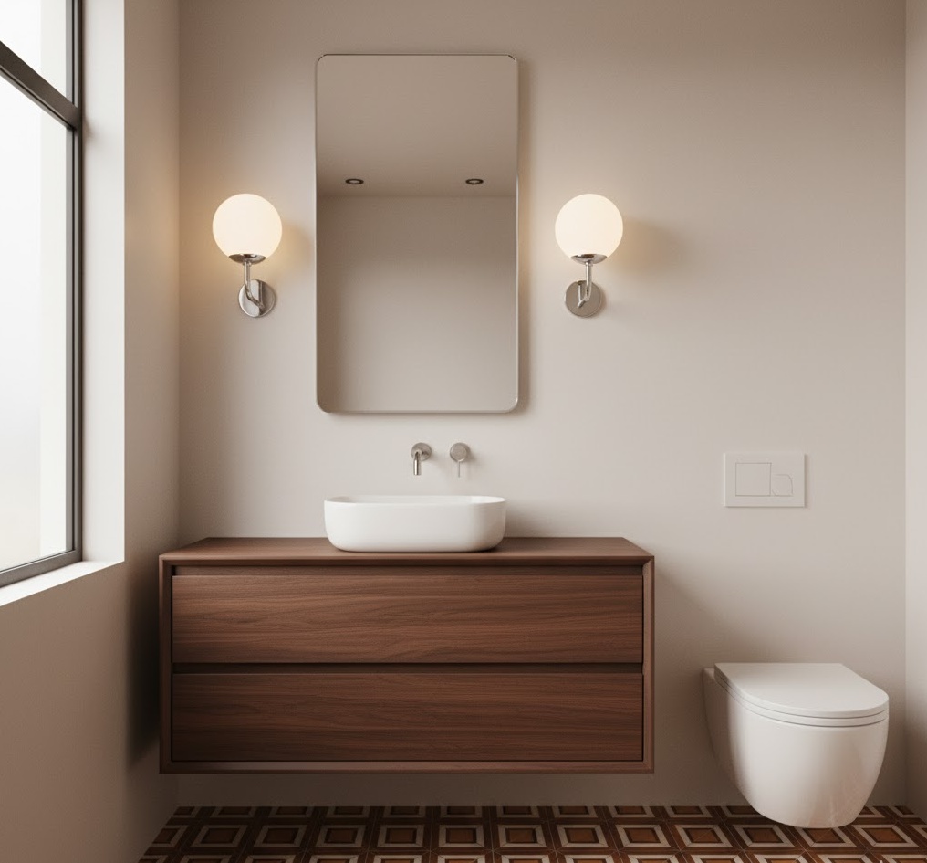 Illuminate your vintage 70s bathroom with the distinctive charm of groovy globe lighting, a quintessential feature of the era. Spherical light fixtures, often in frosted or smoked glass, were popular for ceiling lights, vanity sconces, or even pendant lamps, casting a soft, diffused glow. These lights add a playful yet sophisticated touch, enhancing the retro atmosphere without being overly ostentatious. Pair them with simple, clean lines and perhaps some chrome accents to let the lighting truly shine. Functionality is excellent, providing ample illumination, while the mood is undeniably cool and stylish, perfectly capturing the 70s’ unique approach to interior lighting.