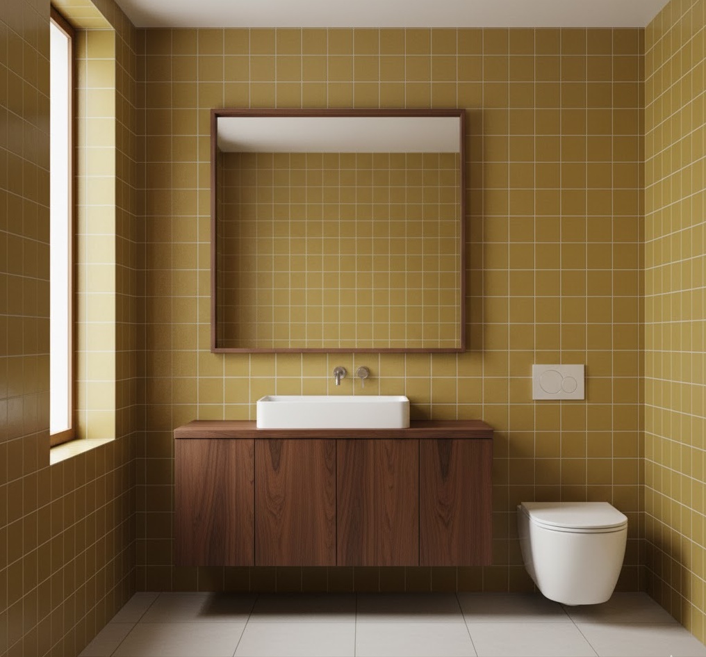Infuse your vintage 70s bathroom with a cheerful and sophisticated glow using mustard yellow, a wonderfully versatile and period-appropriate colour. This deep, warm yellow hue can be incorporated through wall tiles, painted cabinetry, or even a statement bathmat, creating an inviting and energetic atmosphere. It pairs beautifully with dark woods, olive greens, or even a touch of burnt orange for a truly authentic retro feel. Functionality is easily maintained with classic white sanitaryware, allowing the mustard yellow to be the star. The mood is bright and optimistic, yet grounded, offering a unique blend of vintage charm and contemporary appeal.