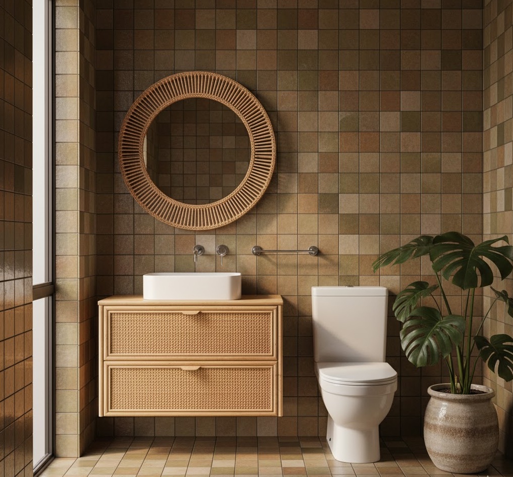 Introduce a touch of natural elegance and bohemian flair to your vintage 70s bathroom with rattan furnishings. Rattan, a lightweight and versatile material, was a staple of 70s interior design, often seen in vanity units, shelving, or decorative accents. Its woven texture adds warmth and an organic feel, complementing earthy colour palettes and lush greenery. Pair rattan with simple white sanitaryware and perhaps some macrame or woven textiles for a cohesive look. Functionality is maintained through its durable yet airy construction. The mood is relaxed, airy, and effortlessly chic, creating a serene and stylish retreat that embodies the era’s connection to natural materials.