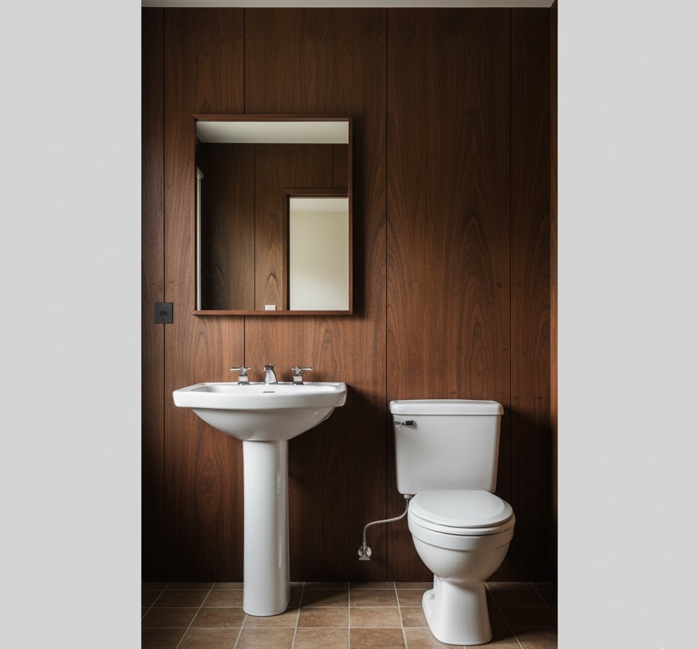 Infuse warmth and a touch of rustic charm into your vintage 70s bathroom with authentic wood panelling. Often seen in darker stains like walnut or teak, wood panelling can cover full walls or be used as a wainscoting, instantly creating a cosy and inviting atmosphere. This material provides excellent insulation and a natural texture, contrasting beautifully with ceramic or tiled floors. Pair it with simple, white or cream sanitaryware to allow the wood’s richness to truly shine. Functionality is enhanced by the durable nature of wood, while the overall mood is one of comfortable elegance, reminiscent of a stylish country retreat from the era.