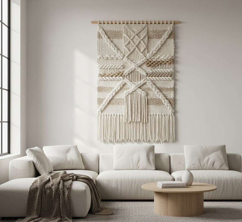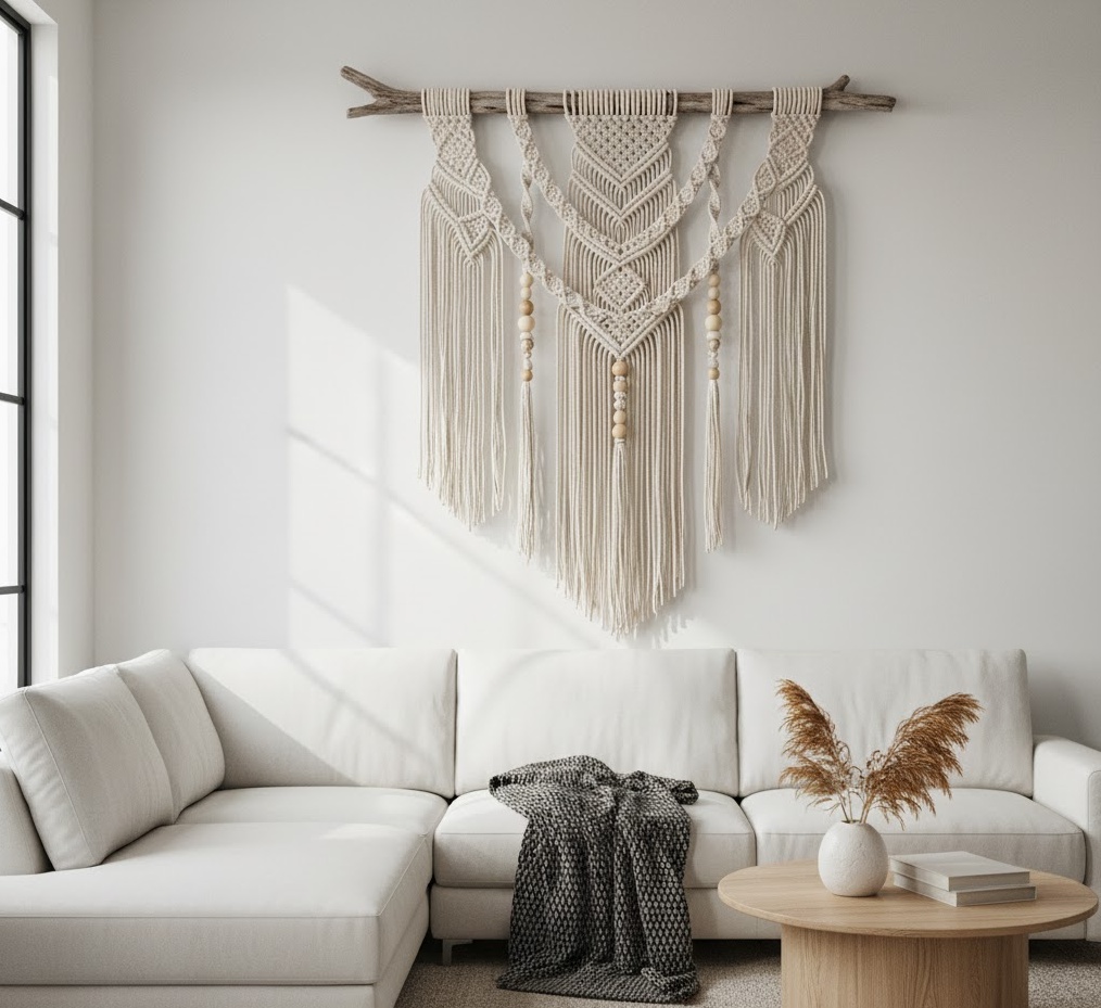 Bohemian macrame wall art introduces a handcrafted, earthy, and free-spirited vibe to your living room, perfect for creating a cosy and eclectic atmosphere. These intricate pieces of wall art for living room are created using knotting techniques, often featuring elaborate patterns, fringes, and tassels that add significant texture and visual interest. Materials are typically natural fibres such as cotton rope, jute, or hemp, sometimes adorned with wooden beads or driftwood, enhancing their organic appeal. The colour palette usually leans towards natural, unbleached tones, creams, and soft earthy hues, though vibrant dyed options are also available for a bolder statement. Functionally, macrame wall art adds a unique, artisanal touch, softening hard walls and contributing to a relaxed, inviting, and globally-inspired living room aesthetic.