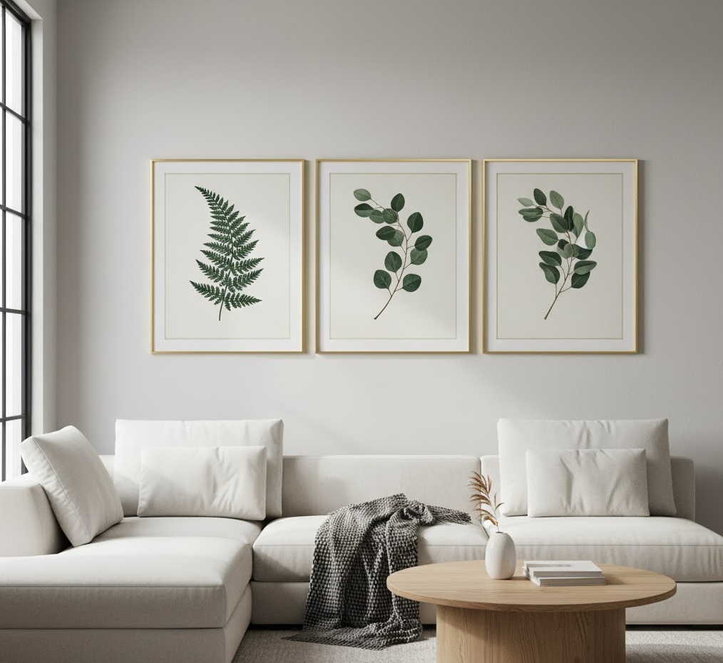 Botanical prints offer a refreshing and timeless aesthetic for the living room, bringing the beauty and serenity of nature indoors. This classic style of wall art for living room typically features detailed illustrations or photographs of plants, flowers, or foliage, often presented in sets or as individual framed pieces. Materials usually involve high-quality paper prints, sometimes giclée, framed with elegant mats and wooden or metal frames, enhancing their sophisticated appeal. The colour palettes are naturally inspired, ranging from vibrant greens and floral hues to more subdued, antique-style sepia tones, creating a calming and harmonious mood. Functionally, botanical prints can introduce a sense of tranquility and organic elegance, connecting the interior space with the natural world and providing a sophisticated touch to any living room decor.
