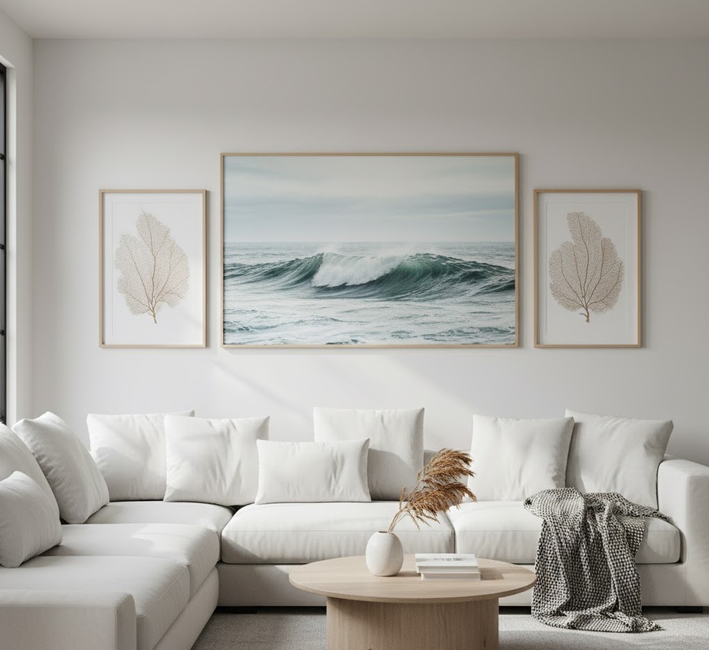 Coastal themed wall decor evokes a sense of calm, relaxation, and seaside charm, transforming your living room into a tranquil retreat reminiscent of the beach. This style of wall art for living room often incorporates elements inspired by the ocean, such as seascapes, marine life, or nautical motifs. Materials frequently include natural wood, distressed finishes, canvas prints, and sometimes actual shells or driftwood, contributing to an authentic, airy feel. The colour palette typically features soothing blues, greens, sandy beiges, and crisp whites, creating a light and inviting atmosphere. Functionally, coastal wall decor can brighten a space, make it feel more expansive, and infuse it with a holiday-like serenity, perfect for creating a relaxed and welcoming living room environment.