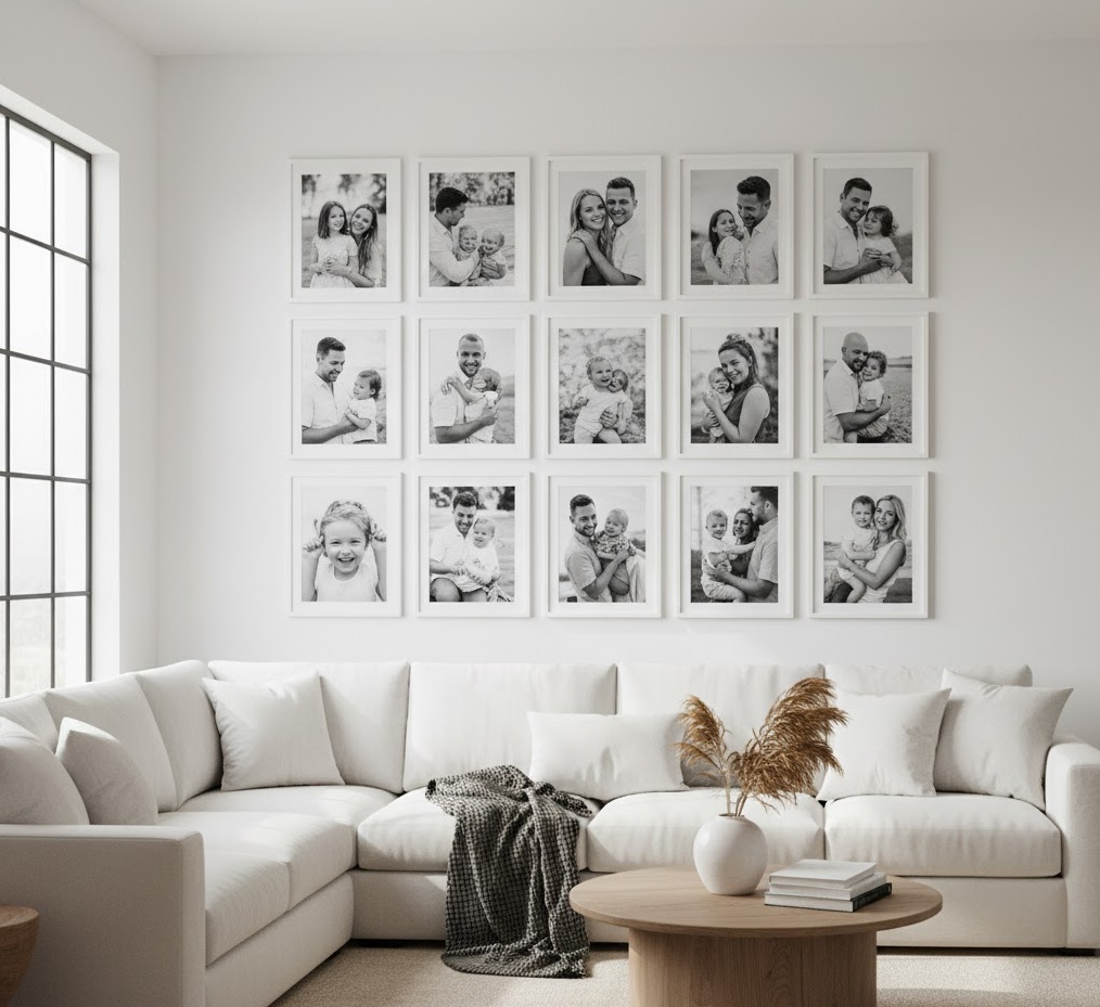 A custom family photo wall creates a deeply personal, heartwarming, and unique display in your living room, celebrating cherished memories and loved ones. This intimate style of wall art for living room transforms personal photographs into a curated exhibition, telling your family’s story through visual narratives. Materials typically involve high-quality photographic prints, often in black and white or sepia tones for a cohesive look, framed in a variety of complementary styles such as classic wood, sleek metal, or minimalist frames. The mood is undeniably warm, inviting, and sentimental, fostering a sense of connection and belonging. Functionally, a family photo wall serves as a constant source of joy and conversation, making your living room feel truly like home and reflecting the unique bond of your household.