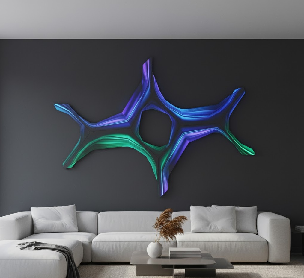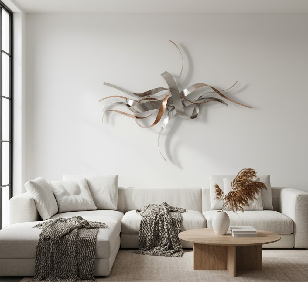 Metal sculpture wall art introduces a striking, three-dimensional element to your living room, offering a contemporary and often industrial-inspired aesthetic. These pieces of wall art for living room break away from traditional flat artwork, adding depth, shadow, and dynamic visual interest to a wall. Materials typically include various metals such as steel, aluminium, copper, or brass, often finished with polished, brushed, or oxidised textures to create different effects. The mood can range from sleek and modern with minimalist designs to intricate and artistic with more elaborate, organic forms. Functionally, metal wall art serves as a powerful statement piece, reflecting light and creating captivating shadows that change throughout the day, making it an excellent choice for adding an edgy yet sophisticated touch to a modern living room.