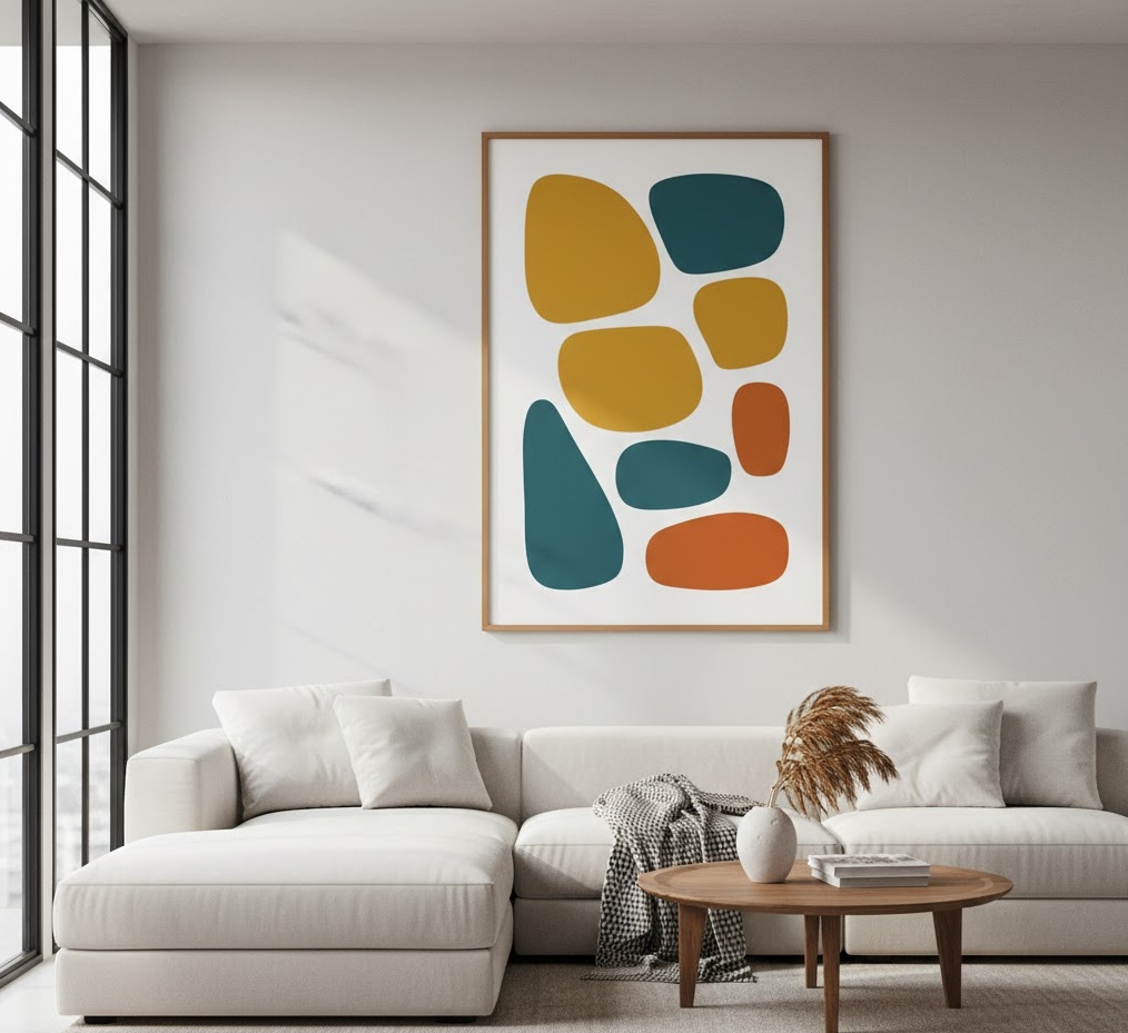 Mid Century Modern art brings a sophisticated, retro-chic aesthetic to your living room, characterised by its clean lines, organic shapes, and often vibrant yet balanced colour schemes. This style of wall art for living room draws inspiration from the design movement of the mid-20th century, featuring abstract forms, geometric patterns, and sometimes stylised figurative elements. Materials commonly include framed prints on high-quality paper, canvas, or even wooden panels, often with a focus on graphic simplicity and bold compositions. The mood is typically optimistic, stylish, and forward-thinking, reflecting the era’s innovative spirit. Functionally, Mid Century Modern wall art can tie together a retro-inspired living room or add a touch of vintage cool to a contemporary space, providing a timeless appeal that remains highly sought after.