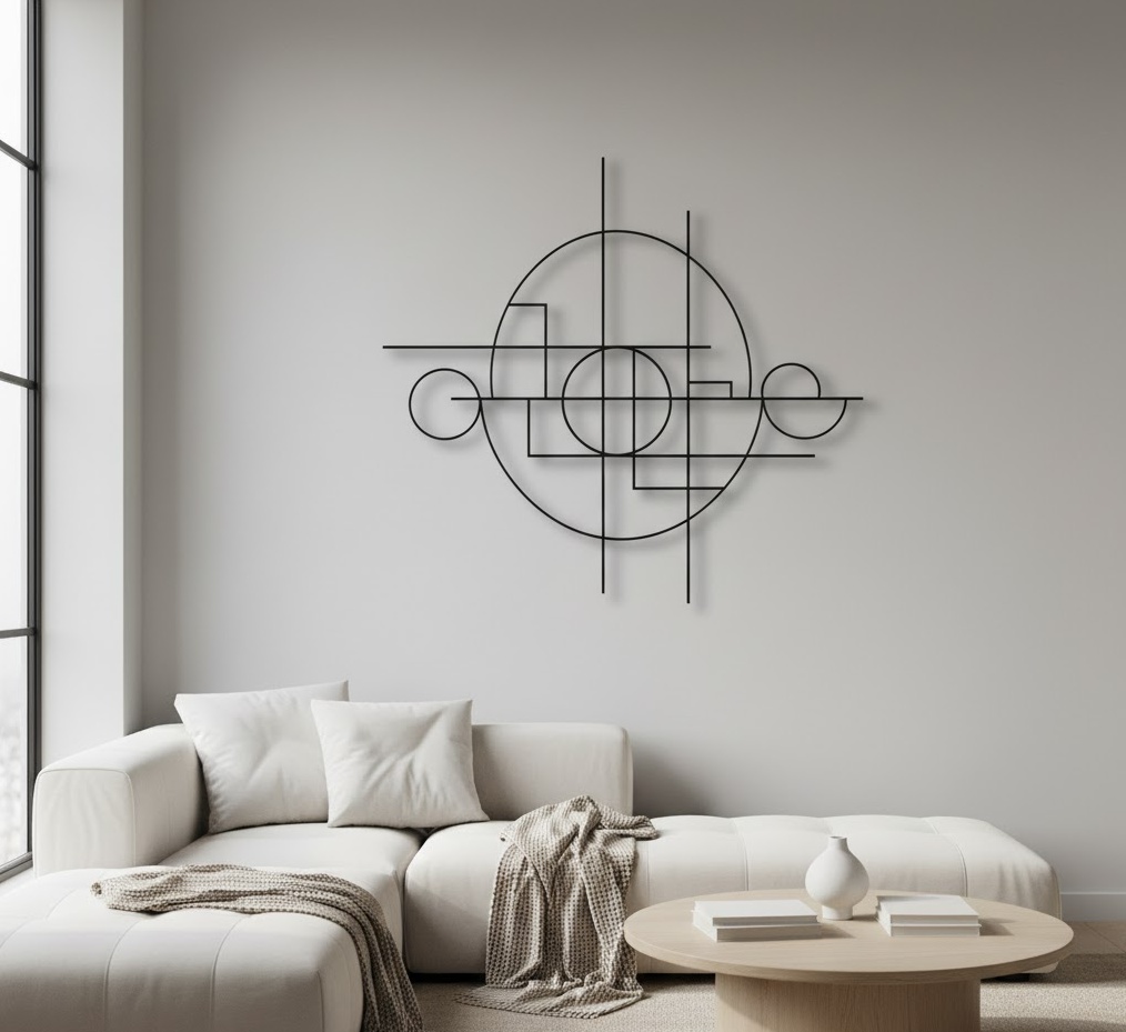 Minimalist geometric wall art brings a sense of order, sophistication, and contemporary elegance to any living room, perfect for those who appreciate clean lines and understated design. This style of wall art for living room often features simple shapes, precise patterns, and a limited colour palette, typically monochromatic or with subtle accent hues. Materials commonly include metal sculptures, framed prints with graphic designs, or even painted murals directly on the wall, emphasising form and negative space. The mood is typically calm, serene, and uncluttered, promoting a sense of spaciousness and modern refinement. Functionally, minimalist geometric wall art enhances the architectural elements of a room without overwhelming it, providing visual interest through its precise composition and thoughtful placement, making it a smart choice for a modern living room.