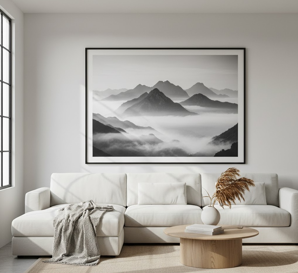 Large scale living room art makes an undeniable statement, transforming an entire wall into a captivating focal point and instantly elevating the room’s grandeur. A single, oversized piece of wall art for living room can anchor the space, drawing the eye and creating a sense of drama and sophistication. Materials often include expansive canvases, multi-panel prints, or large format photographic prints, typically framed minimally or presented as gallery-wrapped canvases to maintain focus on the artwork itself. The mood conveyed can range from serene and expansive with a landscape, to bold and energetic with an abstract piece, depending on the chosen imagery and colour palette. Functionally, this type of wall art simplifies decor by eliminating the need for multiple smaller pieces, offering a clean, impactful aesthetic that defines the living room’s character.