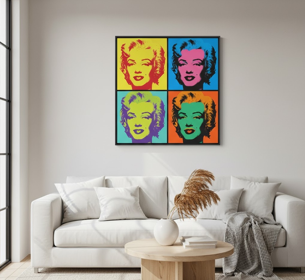 Pop Art inspired wall decor injects a vibrant, playful, and often ironic energy into your living room, drawing from popular culture and commercial imagery. This bold style of wall art for living room is characterised by its bright, saturated colours, graphic lines, and often repetitive or iconic motifs, reminiscent of comic books and advertising. Materials commonly include canvas prints, framed posters, or even metal signs, often featuring silkscreen-like effects or bold outlines. The mood is typically energetic, fun, and rebellious, making a strong visual statement that challenges traditional art forms. Functionally, Pop Art wall decor can serve as a dynamic focal point, express a modern and unconventional personality, and add a splash of unapologetic colour and wit to any contemporary living room.