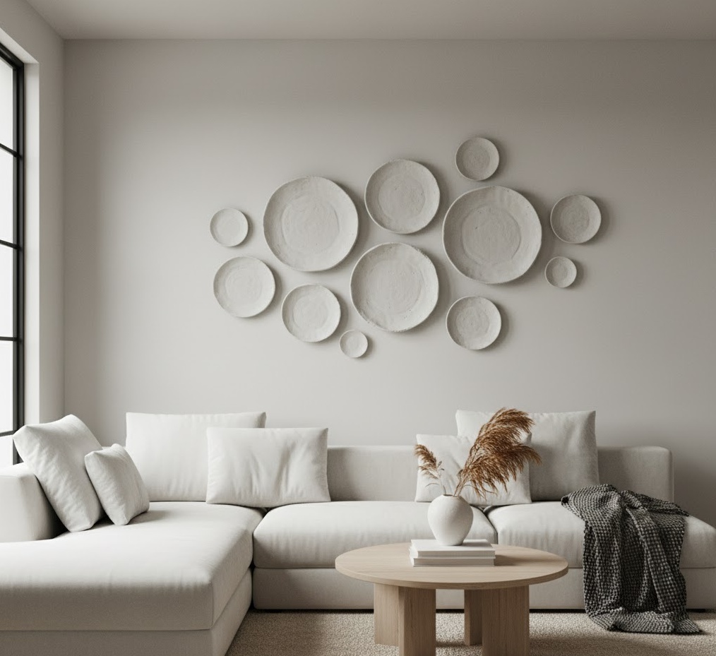 Sculptural ceramic wall art introduces an organic, artisanal, and three-dimensional texture to your living room, celebrating craftsmanship and natural forms. These unique pieces of wall art for living room often feature hand-moulded shapes, intricate patterns, or abstract compositions, adding a tactile and earthy elegance to any space. Materials are primarily ceramic or porcelain, often with various glazes, finishes, and sometimes unglazed, showcasing the raw beauty of the clay. The mood can range from rustic and grounded to sophisticated and artistic, depending on the design and finish. Functionally, ceramic wall art provides a distinctive focal point, adding depth and shadow play to a wall, and offering a beautiful counterpoint to flatter surfaces, making it a refined and unique choice for a discerning living room.
