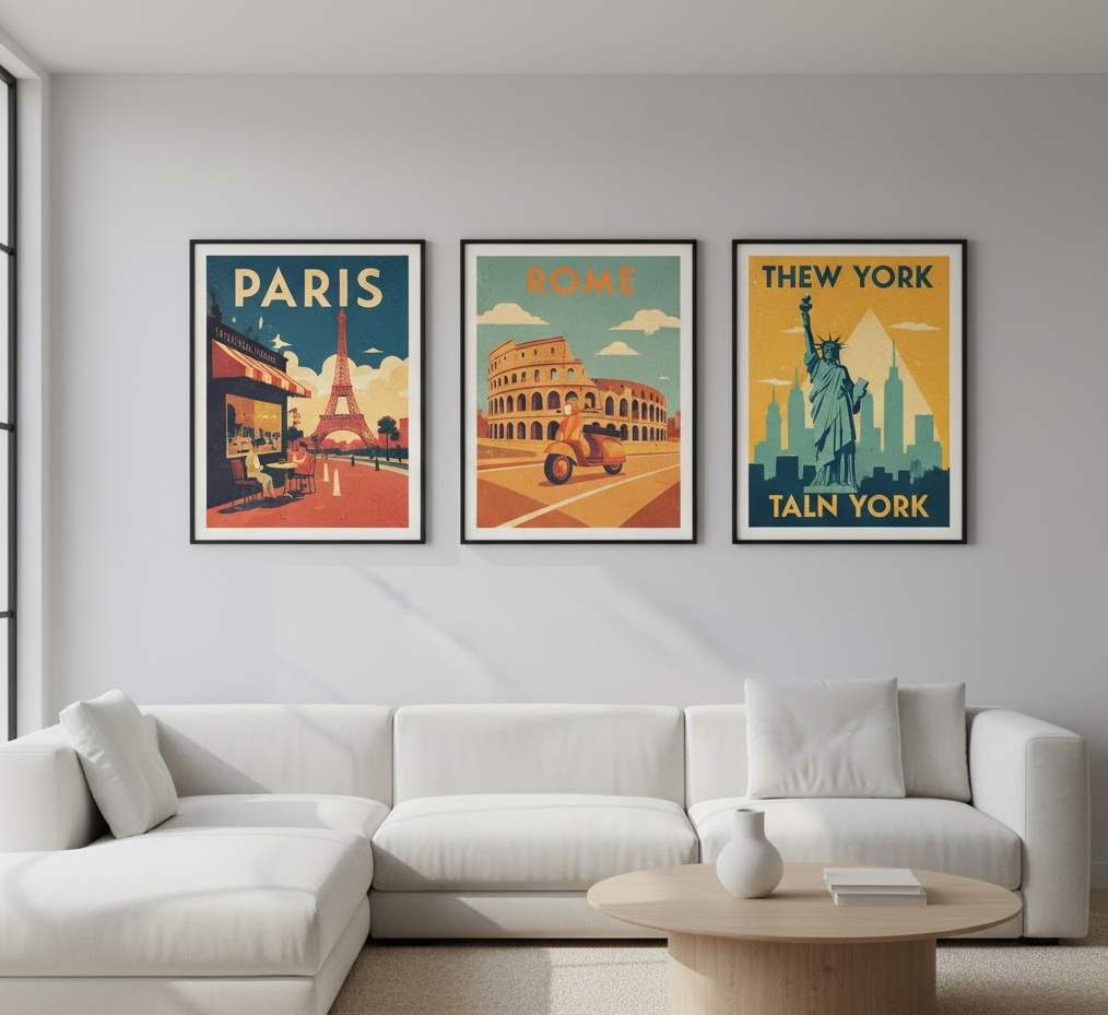 Vintage travel poster art injects a sense of nostalgia, adventure, and vibrant colour into your living room, celebrating iconic destinations and classic design. These charming pieces of wall art for living room often feature stylised illustrations of famous landmarks, exotic locales, or retro modes of transport, evoking a bygone era of glamourous travel. Materials typically include high-quality paper prints, often reproduced from original designs, framed with simple wooden or metal frames to let the artwork shine. The colour palettes are usually bold and graphic, with a distinct mid-century or Art Deco aesthetic, creating a cheerful and inspiring mood. Functionally, vintage travel posters can spark wanderlust, add a playful yet sophisticated touch, and serve as a conversation starter, making them a delightful and distinctive choice for living room wall art.