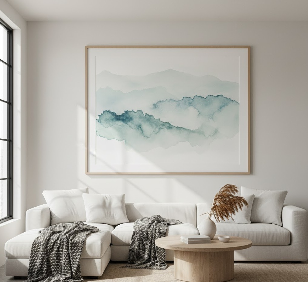 Watercolour landscape art brings a serene, ethereal, and often dreamlike quality to your living room, capturing the beauty of nature with a delicate touch. This style of wall art for living room is characterised by its soft washes of colour, fluid lines, and translucent effects, creating a sense of depth and tranquility. Materials typically include high-quality watercolour paper, often framed with a mat and glass to protect the delicate artwork, or sometimes printed on canvas for a more contemporary feel. The colour palettes are usually gentle and nuanced, featuring muted greens, blues, and earthy tones, evoking a calm and contemplative mood. Functionally, watercolour landscapes can open up a space, provide a soothing visual escape, and add a touch of understated elegance, making them a perfect choice for a peaceful living room environment.